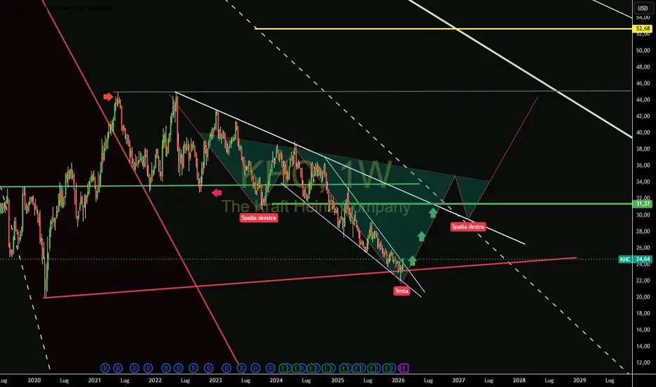 Il titolo ha invertito con volumi Importanti il target di rottura dell'attuale trinagolo isoscele fa presupporre un primo Target in area 31 $ circa , il testa è spalle in formazione dà un target importante intorno au 43-45 $.
