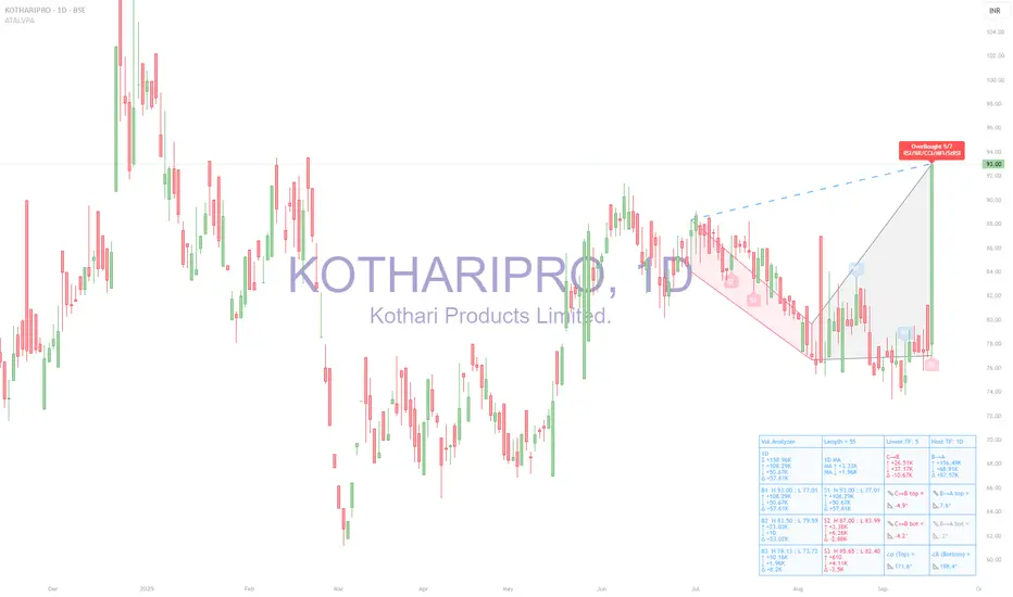 The stock made a sharp +20% move today up to 93, and the indicator flagged an “OverBought” condition. That means buying pressure was unusually strong and the market may need to cool off with a pause or short pullback. Still, the recent volume balance shows buyers remain in control, so the broader structure is still constructive.
