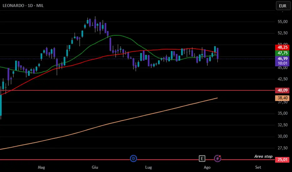 Leonardo rompe con forza al ribasso dopo settimane di lateralità e chiude con piu di un -5%. La rottura della zona dei 47,5€, insieme alla perdita delle medie mobili a 20 e 50 periodi, aumenta la pressione ribassista. A questo punto il titolo sembra diretto verso l’area dei 40€, che rappresenta un supporto importante e corrisponde anche alla 200 periodi. Possibile continuazione del movimento se non recupera velocemente i 48€.