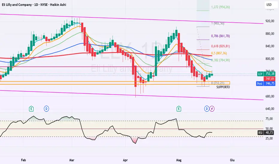 Attualmente il prezzo sta consolidando tra 715 e 730 USD, area in cui ha già mostrato più volte forti rimbalzi, confermati anche da segnali tecnici come il rimbalzo dell’RSI intorno al livello 20.
