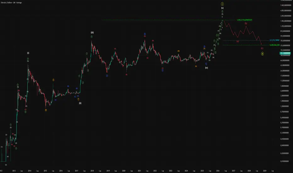 I believe Litecoin is going to exit a big 8 years corrective running triangle and ultimately reach the target of approximatly 2000$
