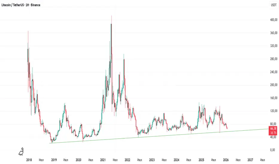 Цена почти дошла до восходящей линии тренда, которая формируется еще с 2018 года. Это ключевой уровень для Litecoin. Если цена пробьет эту линию вниз и закрепится ниже — ситуация для LTC станет негативной.