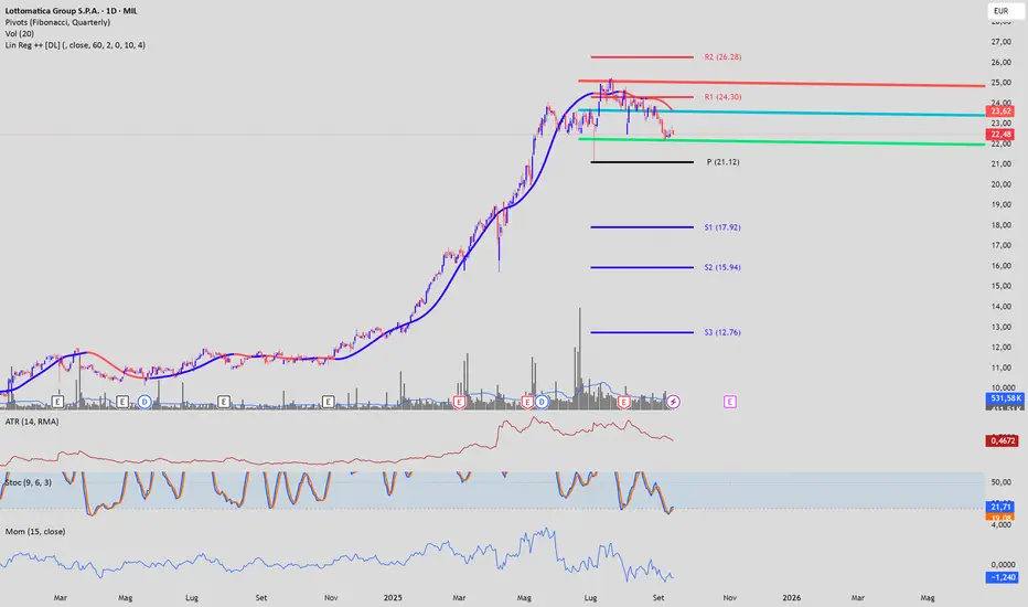 l titolo ha attraversato una fase di robusto trend rialzista a partire dai primi mesi del 2025, culminata con il raggiungimento di un massimo intorno a giugno. Successivamente, è entrata in una fase di correzione o consolidamento laterale, con i prezzi che attualmente si trovano a testare livelli tecnici di cruciale importanza. I prezzi si stanno muovendo nella parte inferiore del canale di regressione, un'area che storicamente ha funzionato come supporto dinamico. Un livello statico fondamentale è rappresentato dal Pivot Point calcolato con metodo Fibonacci, situato a 21,12€. Quest'area di prezzo costituisce il principale supporto di breve termine; una sua tenuta potrebbe favorire una ripartenza del movimento ascendente. Dal punto di vista operativo, si possono delineare delle strategie per posizioni lunghe. Un ingresso in acquisto potrebbe essere considerato in prossimità del supporto a 21,12€, specialmente se accompagnato da segnali di inversione da parte degli oscillatori. Lo Stocastico attualmente tende verso l'area di ipervenduto, suggerendo che la pressione in vendita potrebbe essere in via di esaurimento, considerando anche che ha appena incrociato a rialzo. Un primo obiettivo per una posizione lunga si colloca in corrispondenza della prima resistenza (R1), il cui superamento aprirebbe la strada verso i successivi target a (R2) e potenzialmente i massimi precedenti. Al contrario, per quanto riguarda le possibili posizioni corte, la violazione confermata del supporto a 21,12€ rappresenterebbe un segnale di debolezza significativo. Un tale scenario, avvalorato anche da un indicatore di Momentum che si mantiene al di sotto della linea dello zero confermando la spinta negativa, suggerirebbe un'inversione del trend di breve periodo o l'inizio di una correzione più profonda. In questo caso, il primo obiettivo per una posizione short sarebbe il successivo supporto S1 a 17,92€. È inoltre importante notare come l'ATR (Average True Range) si mantenga su livelli contenuti, indicando una volatilità in diminuzione durante questa fase correttiva, ma un'eventuale rottura dei supporti o delle resistenze chiave potrebbe portare a un rapido aumento della stessa. Gli investitori dovrebbero quindi monitorare attentamente l'interazione del prezzo con l'area 21,12€ - 24,30€ per cogliere segnali direzionali più chiari.