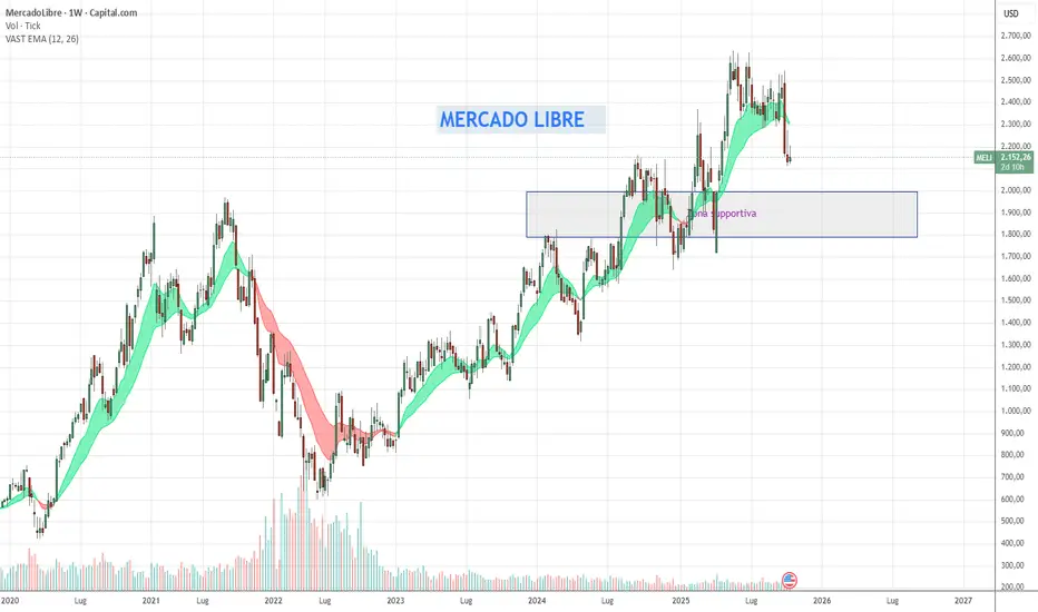 MercadoLibre (ticker: MELI), spesso definita l'"Amazon dell'America Latina", è una società argentina che opera in e-commerce, fintech e logistica. Con una capitalizzazione di mercato di circa 110 miliardi di USD, continua a mostrare una crescita robusta nonostante le pressioni competitive e macroeconomiche.