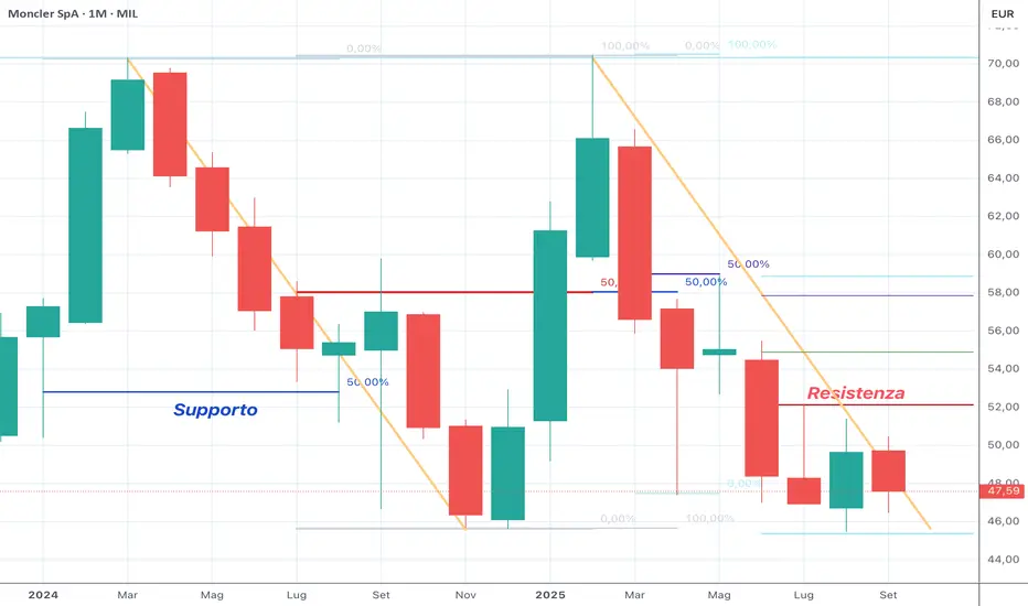 Sul grafico monthly si evidenzia una perfetta simmetria con due movimenti distinti. Il primo risale a marzo 2024, quando Moncler aveva toccato un massimo a 70,34€, seguito da una discesa fino al minimo di novembre a 45,66 euro.