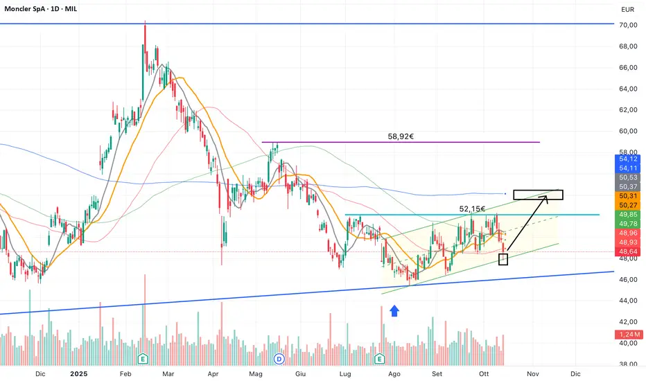 Probabilmente seguirà nei prossimi giorni la risalita per rompere definitivamente la resistenza dei 52€ e poi dirigersi verso la sma200 (linea blu) sui 54€