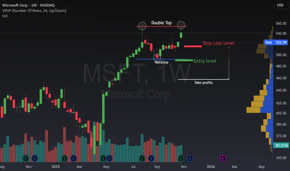 The weekly chart of Microsoft (MSFT) is showing a potential Double Top formation, a classic sign that bullish momentum might be losing strength.