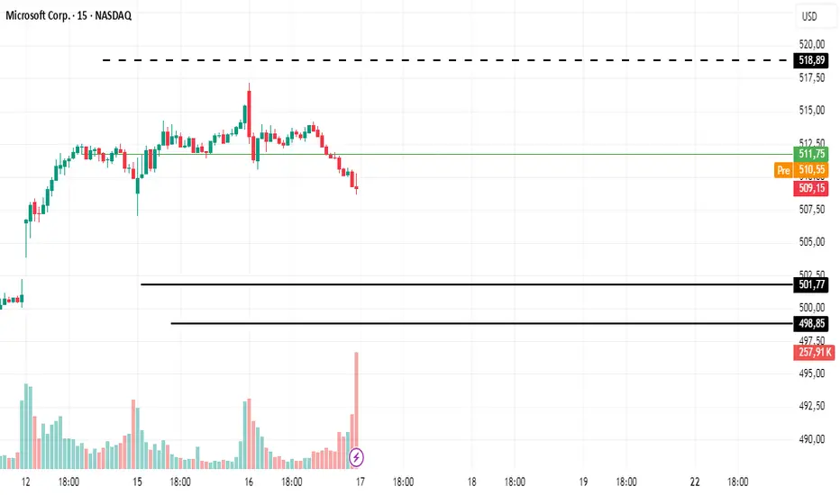 Microsoft (MSFT) ha avviato una fase di debolezza, con prezzi che non sono riusciti a raggiungere l’area di **518,89**, che resta una resistenza potenziale e livello di attenzione per i prossimi movimenti.