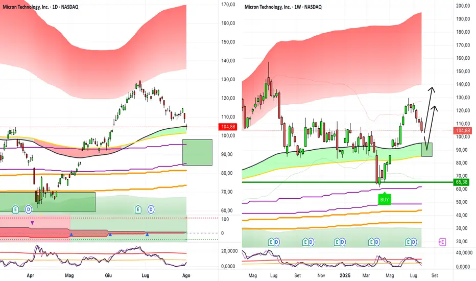 Adesso andiamo a vedere cosa ci dice il grafico di Micron osservando i timeframe daily (a sinistra) e weekly (a destra).