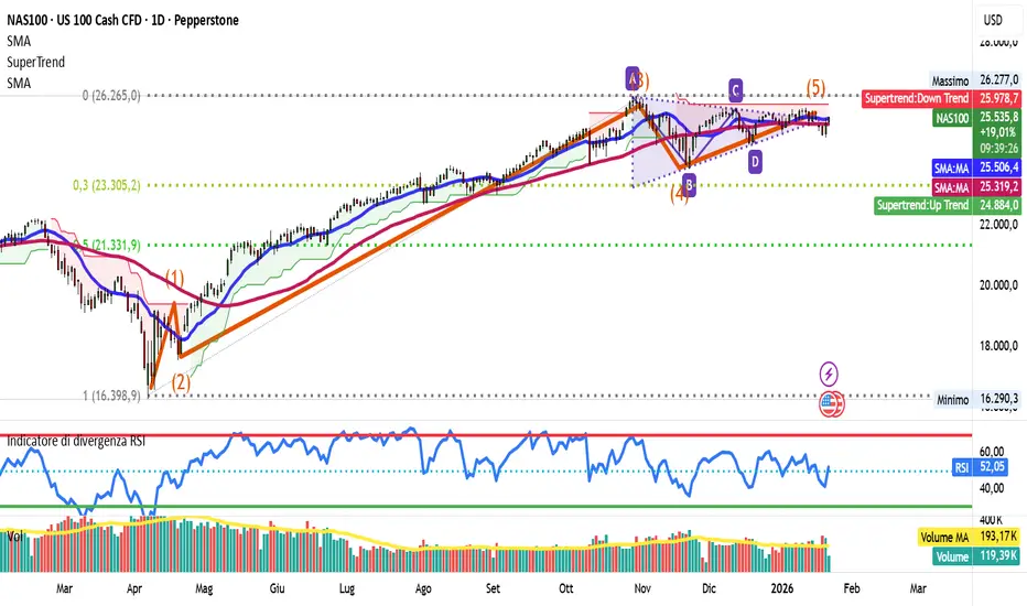 Il quadro tecnico del NASDAQ 100 mantiene un'impostazione rialzista di medio periodo, sorretta da medie mobili in uptrend, RSI in territorio positivo e canale di regressione lineare con slope ascendente.