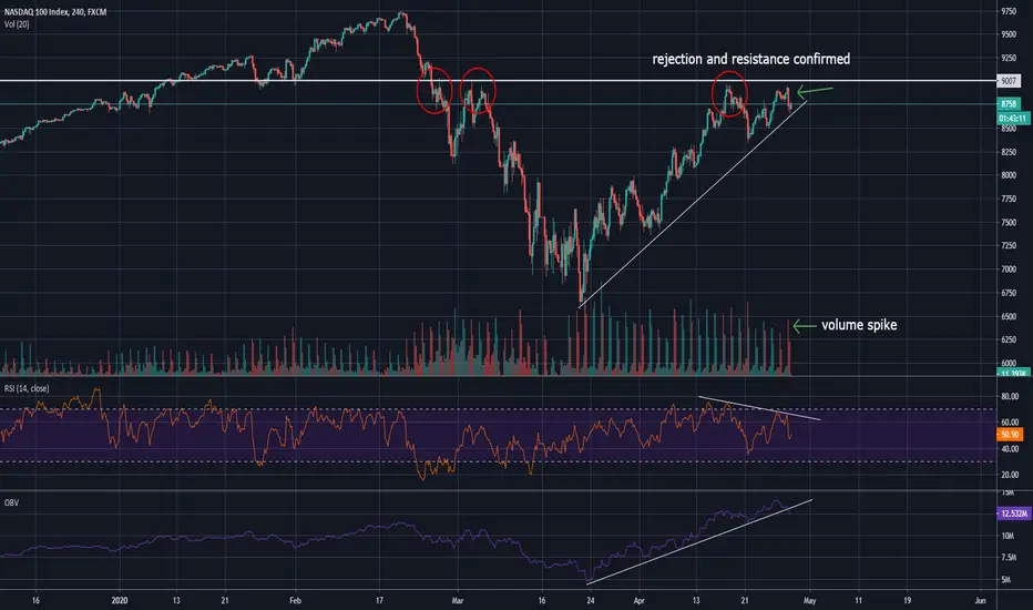 With RSI diverging and OBV looking for a reversal back downwards, the bear case is still strong on both the S&P and the NDX.