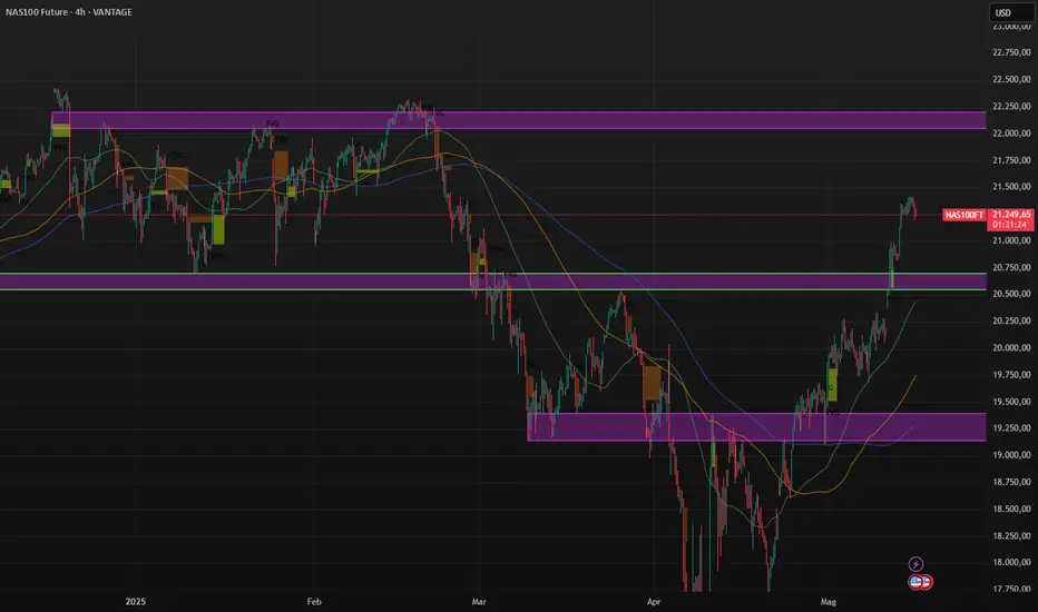 Ho deciso di riaprire posizioni long sul Nasdaq 100 in area 20.550, un livello che si è dimostrato cruciale sia dal punto di vista tecnico che psicologico. Questo punto rappresentava un’area di svolta potenziale, dove il mercato avrebbe potuto scegliere se proseguire la fase di ritracciamento iniziata dai massimi o riprendere la spinta rialzista che ha caratterizzato buona parte dell’ultimo trimestre. L'analisi tecnica e il contesto macroeconomico suggerivano che 20.550 potesse fungere da supporto strategico, e i primi segnali di stabilizzazione su questi livelli hanno rafforzato la mia convinzione di entrare a mercato.