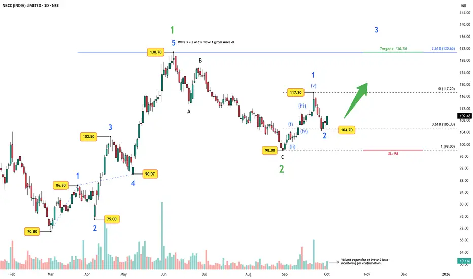 After completing a textbook 5-wave advance into 130.70, where Wave 5 aligned exactly with the 2.618 extension of Wave 1 projected from Wave 4, NBCC corrected into 98. That low now marks a clean green Wave 2.