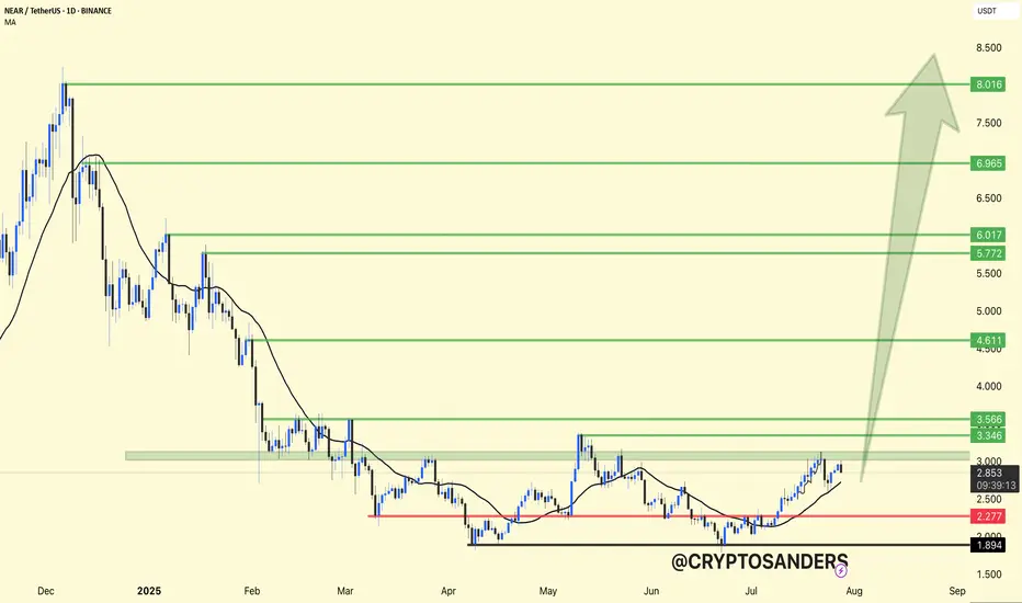 NEAR has broken out of its accumulation zone and is now trading above the key support level of $2.27, with a clean higher-low structure forming.