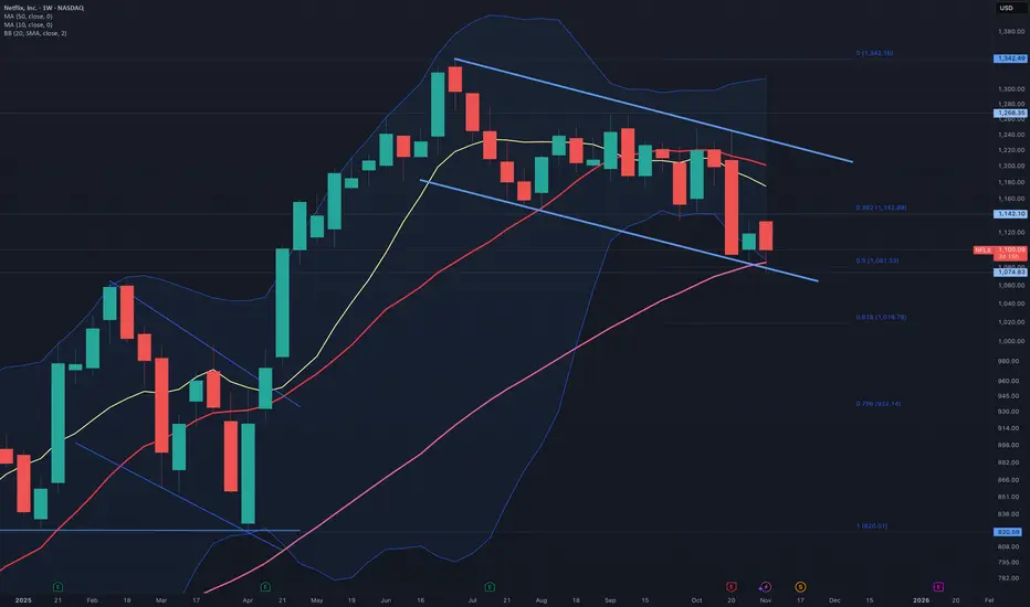 NFLX is showing a bullish flag and has reached the 0.5 retracement level. It has also tested the 50-week SMA twice, indicating it may be ready for a bounce.