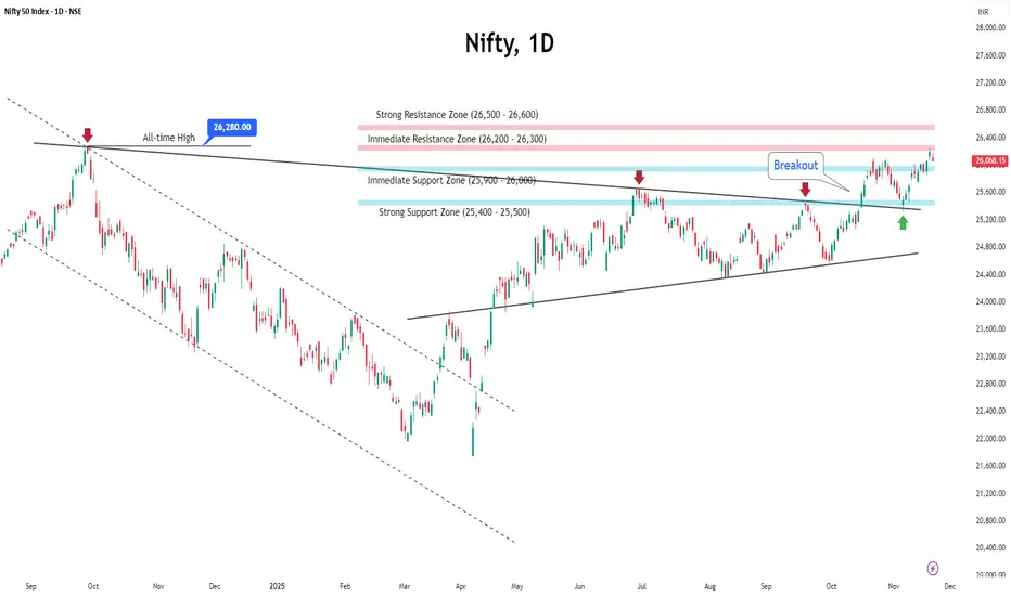Indian markets ended the week on a positive note, with the Nifty rising 0.61% to close at 26,068. This came right after the index hit a fresh 52-week high of 26,246 on November 20 before cooling off.