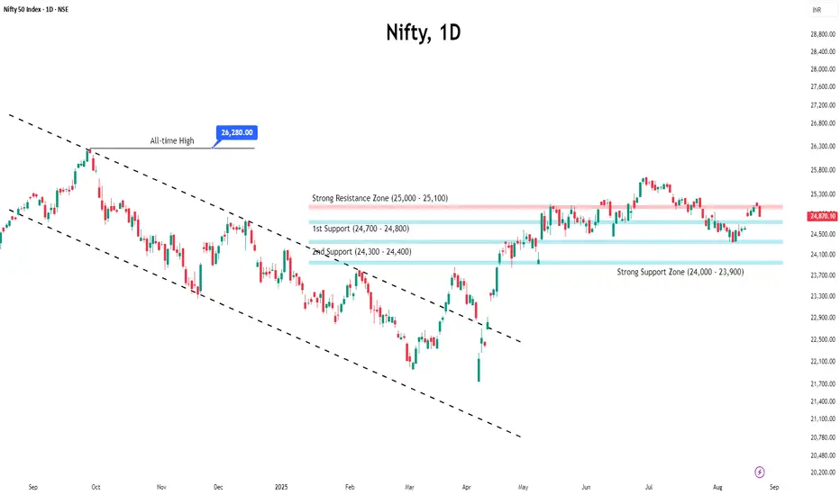 The Nifty faced rejection from the key resistance zone of 25,000–25,100, which may trigger further downside towards 24,500–24,400.