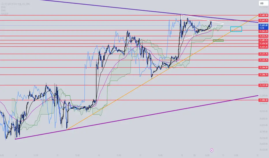 21682.5에서 남아 있는 저항 추세선 및 최근 고점 상방 돌파 시 진입.