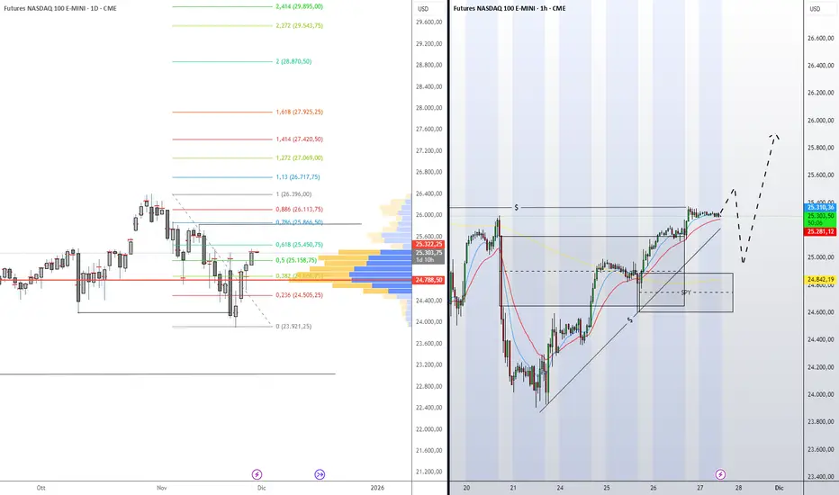 Oggi porto un’analisi approfondita sul Nasdaq 100, partendo dalla fase laterale in costruzione dopo il massimo del 30 ottobre 2025 a 26.454,50. È un’area di esitazione tecnica, ma anche un punto di accumulo informativo molto interessante, soprattutto se osserviamo come si stanno muovendo volumi e liquidità.