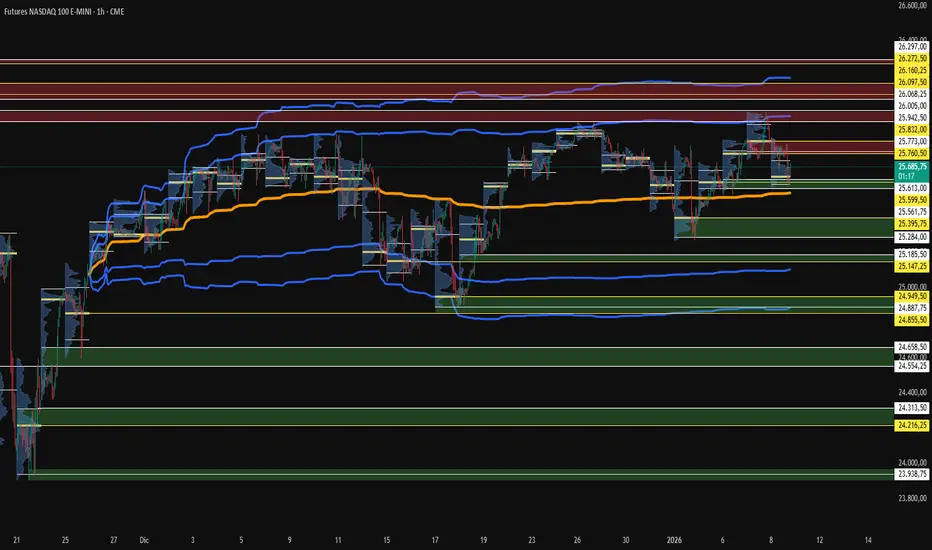 Dal 25 novembre 2025 il Nasdaq si trova in una fase di mean reversion. Il prezzo sta oscillando in prossimità del Fair Value, attualmente localizzato in area 25.560, senza aver ancora definito una direzionalità chiara.