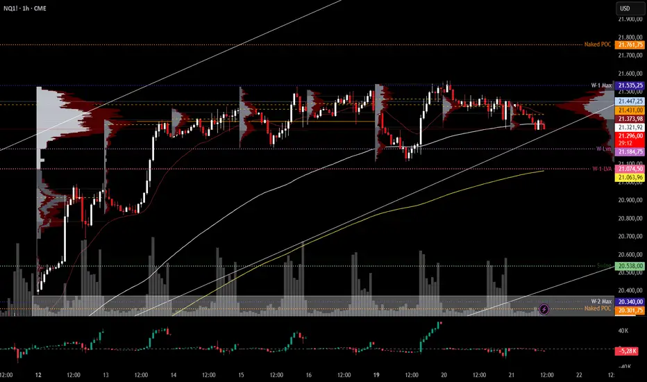 Il volume profile settimanale al momento si sviluppa con una forma a D-shape confermando la tesi fatta in precedenza, tra i massimi della scorsa settimana a 21535 identificata come resistenza e la LVA previous week 21074 che nella giornata di lunedì ha già svolto la funzione di supporto.