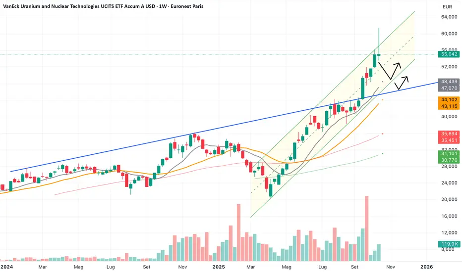 Il prezzo ha raggiunto il margine superiore del canale viola, a questo punto è possibile un breakout rialzista oppure una breve correzione verso il fondo del canaleLe dichiarazioni del presidente USA sul nucleare che è "il futuro" comunque fanno capire che si tratta di un investimento a lungo termine