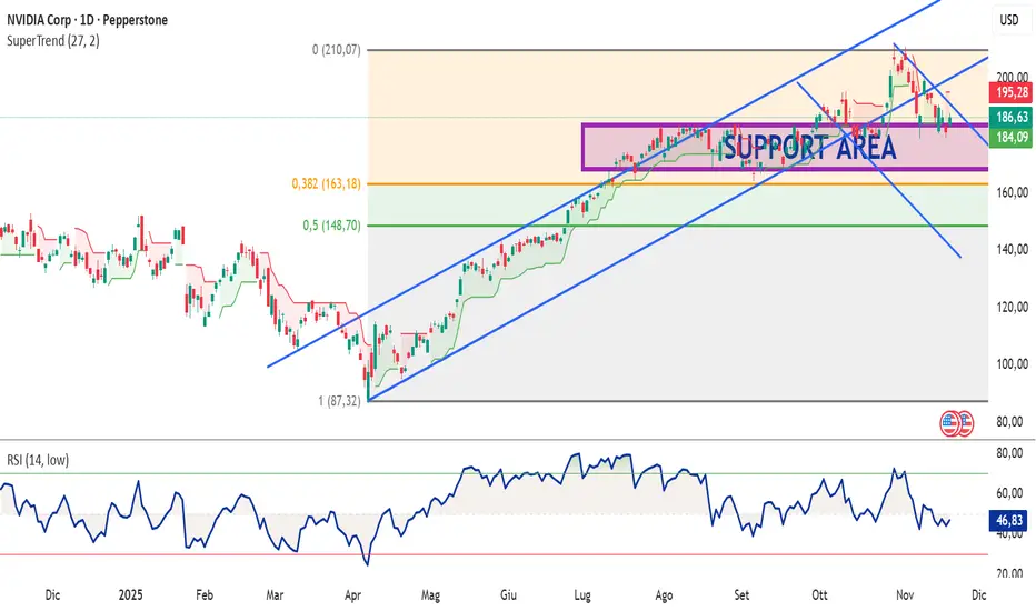 Sul piano tecnico, Nvidia si conferma protagonista di una tendenza strutturalmente rialzista, mantenendo il prezzo stabilmente sopra la media mobile a 50 periodi (MM50) in area 175–180$, considerata da mesi la linea di spartiacque tra fasi bull e bear trend. Questa MM50 ha rappresentato un punto di ingresso privilegiato per acquisti algoritmici e accumulazioni istituzionali durante ogni test di volatilità, risultando il principale livello di difesa nei recenti ritracciamenti.