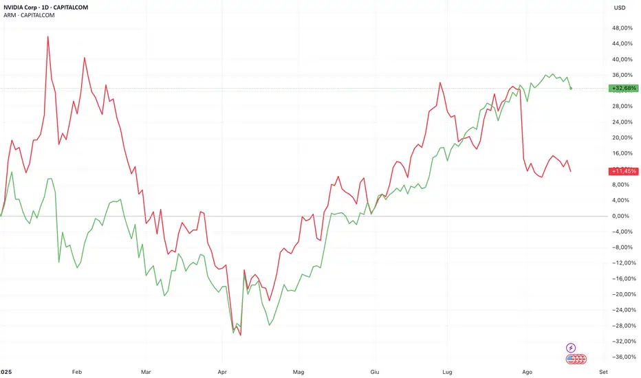 Arm ha seguito la direzione opposta. Il titolo ha registrato un calo dopo risultati deludenti e ora è bloccato al di sotto della media a 50 giorni, aggrappandosi al supporto vicino alla media a 200 giorni. Il consolidamento in questa fase potrebbe creare una base, ma rispetto a Nvidia la situazione appare più difensiva che rialzista.