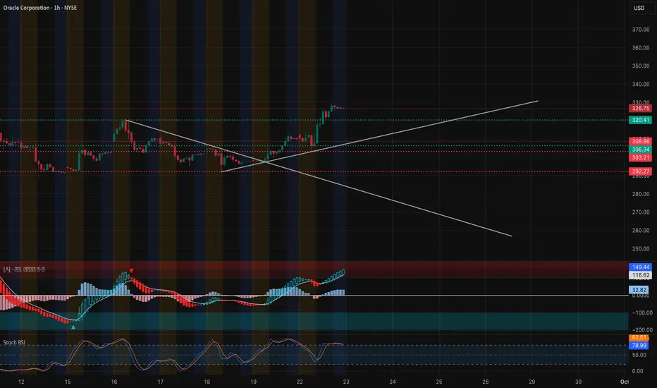 Oracle just ripped out of a multi-day downtrend, clearing the diagonal resistance and launching past the 320 pivot. After tagging 329.5, it’s flagging near 326.7. Support now lines up at 320.4 and 315.9 — a solid shelf from the breakout. As long as price holds above 320 on hourly closes, the uptrend remains strong.