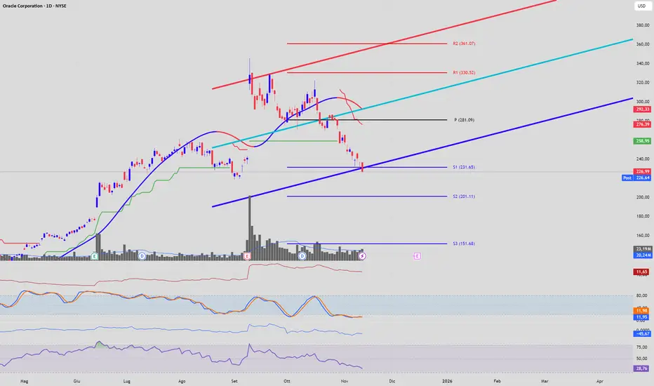 L'analisi del grafico giornaliero di Oracle Corporation mostra un deterioramento tecnico significativo che sposta l'equilibrio a favore delle forze ribassiste nel breve-medio termine. Sebbene il titolo provenga da un robusto trend rialzista, come evidenziato dal canale di regressione ascendente di lungo periodo, gli eventi recenti hanno confermato l'inizio di una correzione profonda. Il segnale di debolezza, già anticipato dalla rottura del Super-trend passato in modalità "rossa", è stato ora convalidato in modo decisivo dalla chiusura confermata al di sotto del cluster di supporto cruciale situato tra 226 (la banda di regressione inferiore a 2 deviazioni standard) e il pivot S1 di Fibonacci. Questa violazione non è un evento secondario: essa invalida la struttura rialzista che ha sostenuto i prezzi per mesi e trasforma radicalmente la dinamica operativa. L'area appena perforata, 221.65-226.00, inverte la sua funzione e diventa ora la prima e più importante area di resistenza da monitorare; qualsiasi tentativo di pullback (rimbalzo tecnico) verso questo livello dovrà ora essere interpretato con scetticismo e potrebbe rappresentare un'opportunità per posizionamenti short. Di conseguenza, l'ipotesi di un ingresso long speculativo su quel supporto è stata annullata. Con la rottura di questo pavimento, la pressione in vendita ha ora un percorso tecnico chiaro verso il prossimo target ribassista, identificato dal supporto S2 a 209.11. Anche gli oscillatori, pur trovandosi in territorio di ipervenduto estremo (con lo Stocastico sotto 12 e l'RSI sotto 30), in questo contesto non segnalano un'imminente inversione, ma piuttosto la forza e la verticalità del momentum ribassista in atto, capace di rompere supporti chiave nonostante le condizioni di "tiraggio".