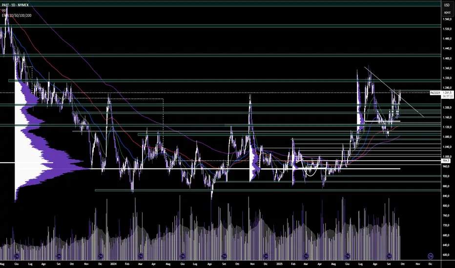 Following this high, palladium began a classic consolidation flag, during which volumes continued to concentrate around the $1150 level. Based on today’s daily candle close [September 25, 2025], it is possible to hypothesize a bullish breakout of both the flag and the $1270 threshold.