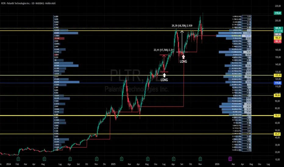 Ieri si è formato un segnale di ingresso long sul grafico giornaliero di Palantir, indicazione di possibile inversione o continuazione rialzista su un timeframe più ampio. Oggi, sul timeframe a 30 minuti, c'è stata un'entrata perfetta in long: il prezzo si è appoggiato proprio sulle medie mobili a 100 e 200 periodi, confermando queste come livelli di supporto dinamici molto importanti.