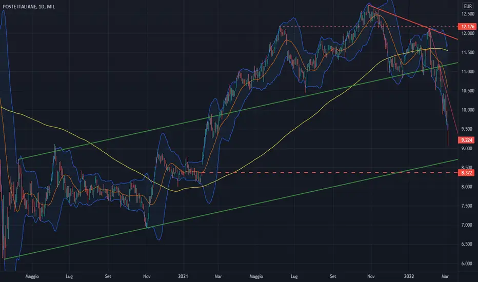 Il titolo Poste Italiane si sta avvicinando al test del supporto dinamico creatosi dopo i minimi del Covid che transita in area 8,65 - 8,70 Euro, da monitorare il titolo nelle prossime sedute nel caso ci sia una reazione in tale area di prezzo.