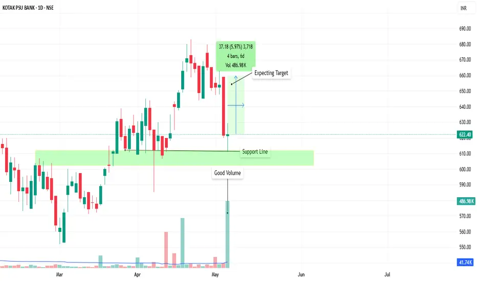 The chart shows a prior support level around ₹620-625 where the price appears to be finding buyers