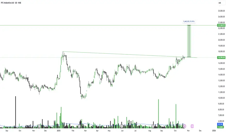 PTC Industries is setting up beautifully for a potential long-term breakout after an extended consolidation phase. The stock has been moving sideways for several months, creating multiple shakeouts around the 13,000–14,000 range — a classic sign of smart money accumulation.