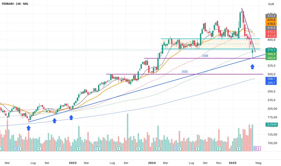 Il prezzo ha incontrato in settimana il supporto dinamico blu e quello statico viola riuscendo a chiudere sopra la sma100 weekly (linea verde)