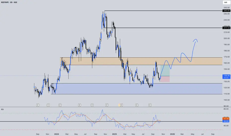 After a brutal 50% crash from ₹245 ATH to ₹120 panic lows, REDTAPE is attempting recovery. Now testing the make-or-break demand zone at ₹155-170.