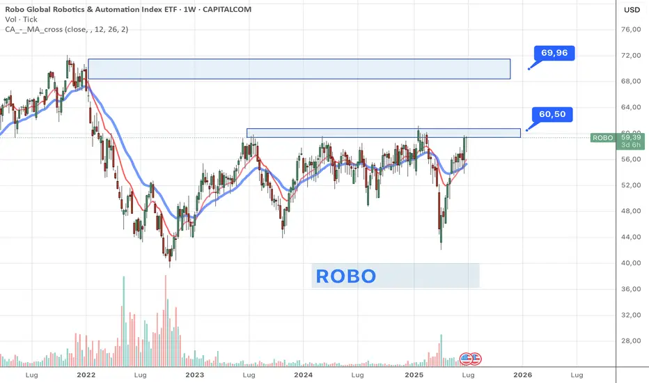 ROBO ETF ha performato +40% dai minimi di Aprile. Adesso è pronto per un importante test di resistenze che se superate possono riportarlo verso 69-70 e quindi alla ricerca di nuovi massimi.