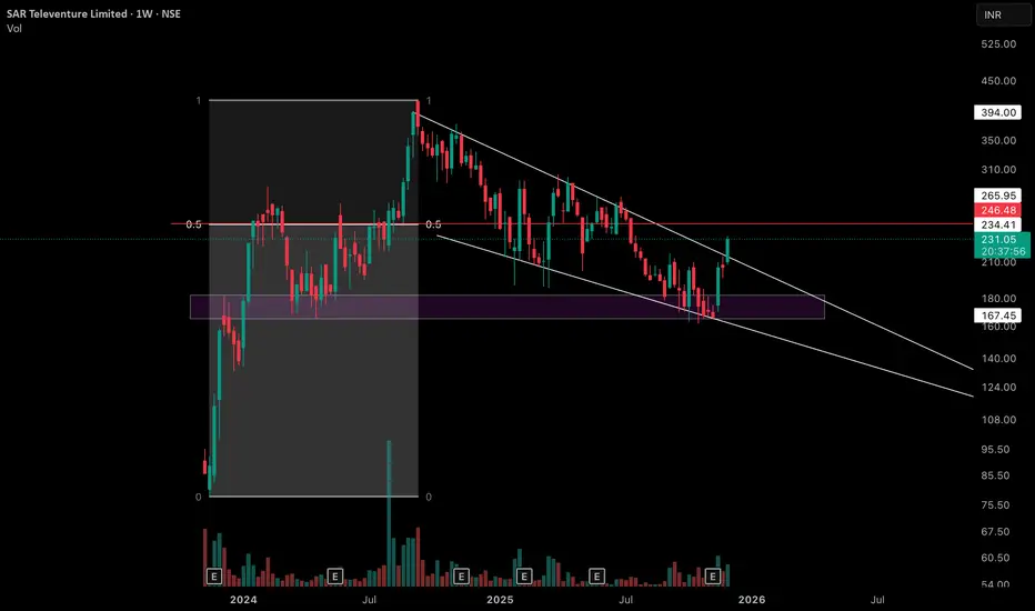 Observation 1 - On this weekly chart of SAR Televenture Limited, price has created an interesting equilibrium between the major swing low and the all‑time high swing high, with the 0.5 level highlighted by the red horizontal line as a key mid‑point reference.