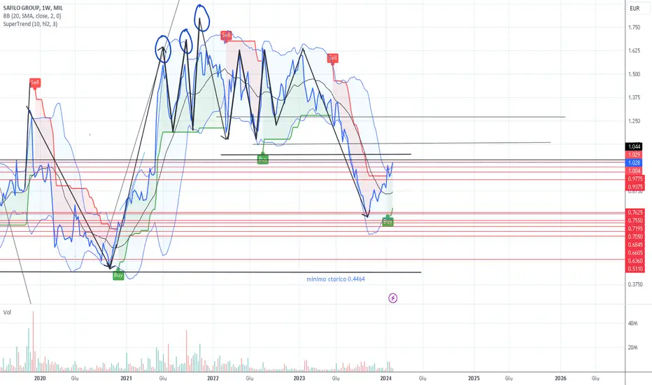 Settimana da incorniciare per Safilo +15.67% contro indice di riferimento Ftse small cap -0.61%, con volumi settimanali che non si vedevano dal 2021, vedo come indicatori un leggero ipercomprato solo su T.F. giornaliero RSI +bollinger bands, dopo due settimane positive di questo genere, anche se tira un po di freno a mano ci può stare, la direzione rimane per il momento invariata indicatori MacD , Super trend, Medie Mobili, Stocastico, indicano il proseguimento della fase UP, primo obbiettivo area 1.18/1.20 , superato questi livelli si prosegue spediti per area 1.30, buone notizie anche dal punto di vista finanziario,Si chiude con un fatturato di oltre 1 miliardo di euro (1.023,9 milioni) il fatturato del Gruppo Safilo, La società, che ha presentato i dati preliminari per l’esercizio chiuso al 31 dicembre 2023 (saranno approvati dal Cda il prossimo 14 marzo), archivia un anno in linea con quello precedente, anche se in leggera flessione (-2,4% a cambi costanti, -4,9% a cambi correnti) rispetto ai 1.076,7 milioni di euro del 2022. Ultima notizia, Il gruppo Safilo continua a credere nell’universo digital. ha comunicato di aver siglato un accordo per l’acquisizione di una quota di minoranza in Spaarkly, azienda nativa digitale specializzata nello sviluppo di soluzioni innovative di e-commerce attraverso la tecnologia della realtà aumentata. Marinai!! assolutamente non abbandonare questa nave, si tornerà in porti visitati nel 2021....Declinazione di responsabilità