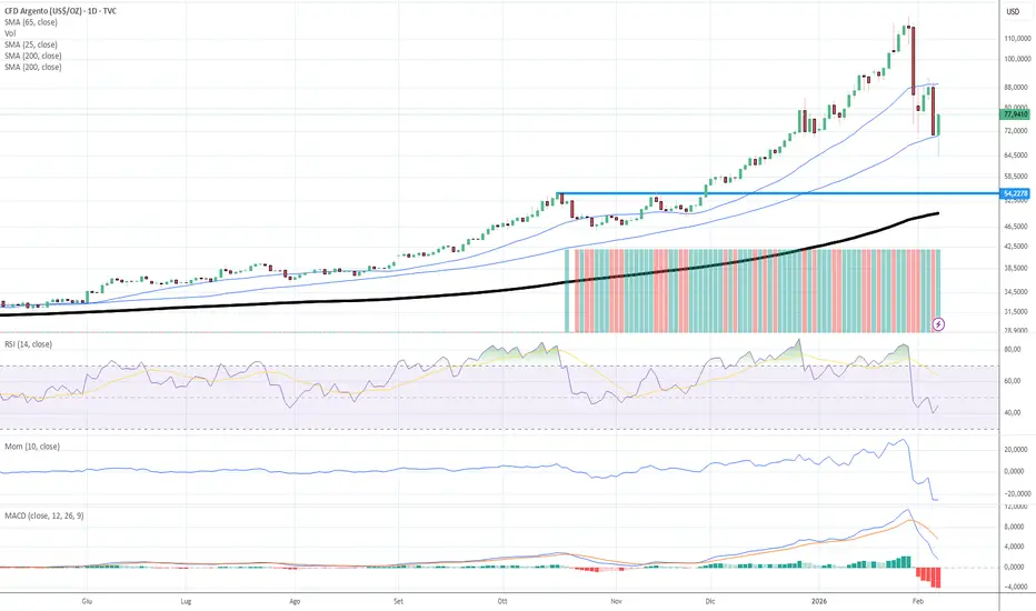 Guardando il grafico sembra scoppiata la bolla finanziaria sull'argento. Indicatori ed oscillatori sono impostati negativamente. Non si esclude nel medio periodo un ritorno averso quota 55.