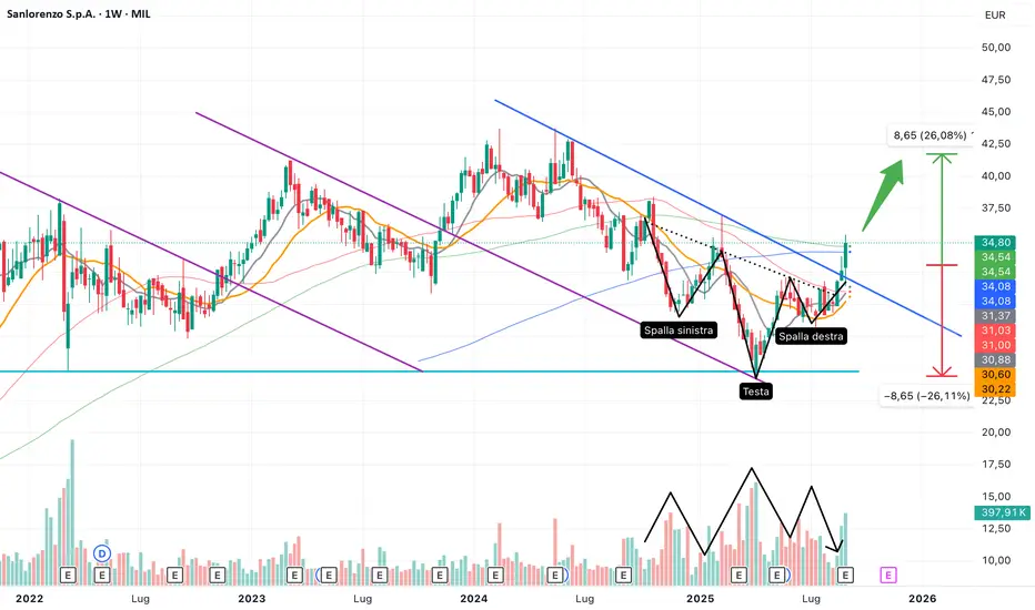 Primo accumulo oggi al contatto con la weekly sma100 a 34,60€ (linea verde)Se scende alla sma200 (linea blu) incremento ancora