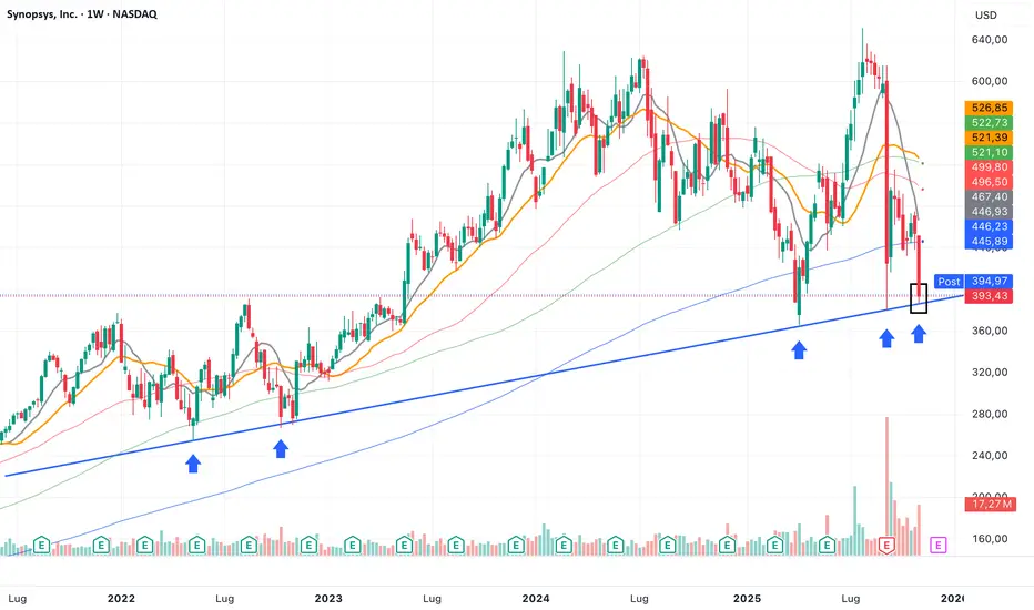 Il prezzo scende a toccare di nuovo il supporto indicato di blu (386$) che sostiene il prezzo da ormai 4 anni