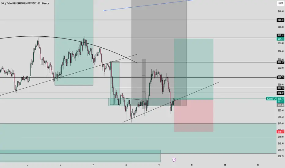 SOLUSDT is approaching a strong demand zone around 216–217 where previous liquidity sweep and accumulation took place. CVD and OI suggest short exhaustion, and funding rates have normalized, indicating a potential shift in momentum.