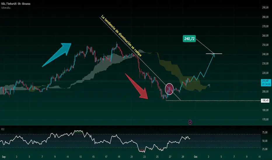 Solusdt cotiza alrededor de 211 USDT, después de terminar la tendencia bajista y superar las nubes de Ichimoku en el marco H3. La motivación creciente a corto plazo se fortalece con la fuerte recuperación del área de soporte de $ 190, creando una señal de inversión significativa.
