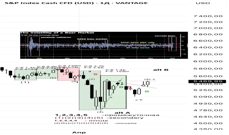Норма для (4) минуэтной волны будет нарушена, если она пересечет минутную волну 1, заполня гэп 2 апреля . Этот уровень также защищен максимумом 10 апреля 5494 (красный пунктир). Подтверждением , что минуэтная волна (4) завершена , послужит погружение ниже 5330. Измеренное движение , будет выполнено если индекс достигнет 5790, промежуточная волна В в этом случае будет завершена. Покупки коммерческих хэджеров говорят о продолжении даун-тренда. Волатильность индекса возрастала свыше 2% трижды за последние 5 лет - это было во время кризиса в 2020, когда дневной диапазон индекса торговался выше 2%, а также во время погружения весной 2022, и в 2025 году . Диаграмма с Блумберг показывает , что сейчас мы перидиваем лишь начало шторма .