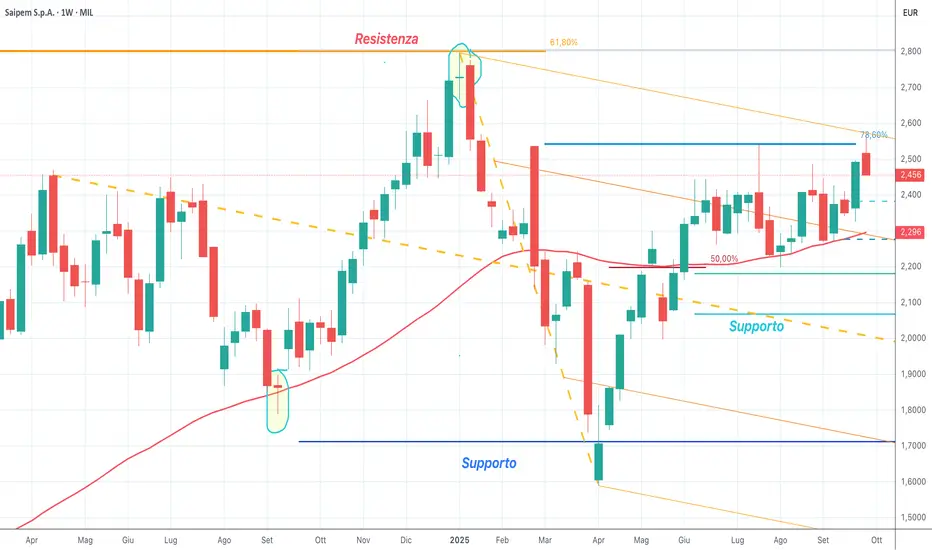 Nell’ultima fase estiva si è visto un recupero costante, con il prezzo che ha consolidato i progressi fino al massimo di questa settimana a 2,566€. In questa zona Saipem ha incontrato la resistenza a 2,55€, coincidente con la diagonale discendente della Forca.