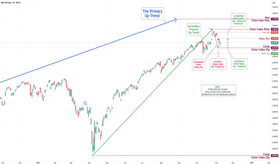 During the recent trading session, the S&P 500 Index experienced a notable decline, underscoring the significance of our key target, situated at the Mean Support level of 6,740. The index has now completed the Outer Index Dip at 6,642. This positioning indicates the potential for further upward movement, with the target established at the Mean Resistance level of 6,795. The prevailing trend suggests a well-structured extension towards the Key Resistance level of 6,893, with an ultimate target for the Outer Index Rally set at 7,110.