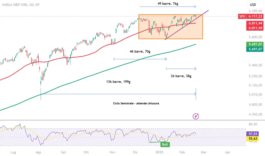Ragazzi, ci siamo: ciclo pluriennale di inverso (da max va su minimi e torna su max) ha i minuti contati. Lato indice dobbiamo chiudere un semestrale, target primario minimo a 5773. THE BIG SHORT è dietro l’angolo: il grafico mostra chiaramente la fase di congestione tra 6000 e 6200, ma anche una perdita di slancio evidenziata dall’RSI, che non riesce a oltrepassare zone di ipercomprato. Se la trendline rialzista dovesse cedere insieme al supporto inferiore del box, potremmo assistere a una rapida accelerazione ribassista, con primo obiettivo proprio in area 5773. La chiusura del ciclo semestrale potrebbe innescare la discesa, accentuando la pressione in vendita e scardinando i minimi crescenti. Occhio, quindi, perché un eventuale break al ribasso fornirebbe un segnale short deciso, in linea con l’idea di “big short” pronta a materializzarsi entro MAX 10 giorni.