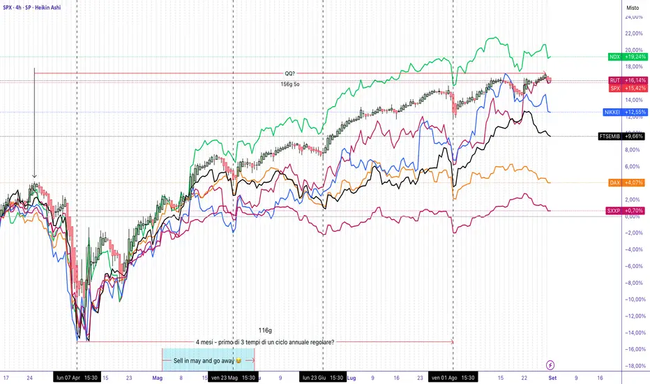 Non so perché, ma in pubblicazione sono scomparse le etichette degli altri indici. Ecco la legenda: verde NDX. Granata in alto Russell. Blu Nikkei. Nero MIB. Arancio DAX. Granato sotto STOXX 600.Declinazione di responsabilità